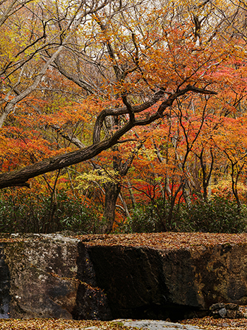 이 중 현수교에서 구장군폭포까지 약 800m 구간은 애기단풍이 만든 붉은 터널로, 사진작가들이 가장 사랑하는 포인트다.